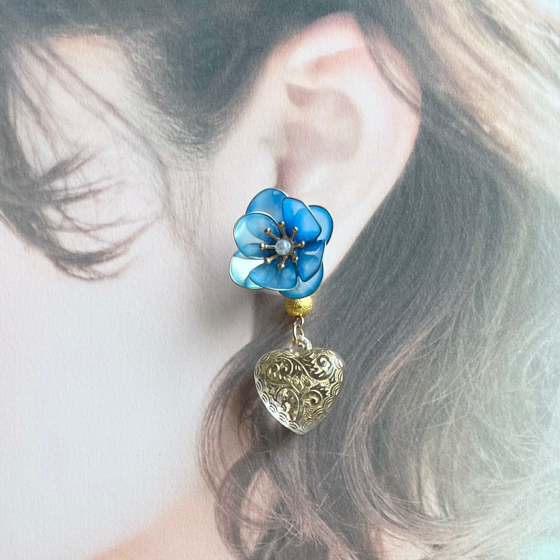 パールブルーのアネモネとクリアハートが揺れるイヤリング/ピアス【ディップアート/金属アレルギー対応:サージカルステンレス製】