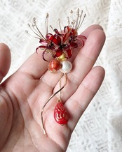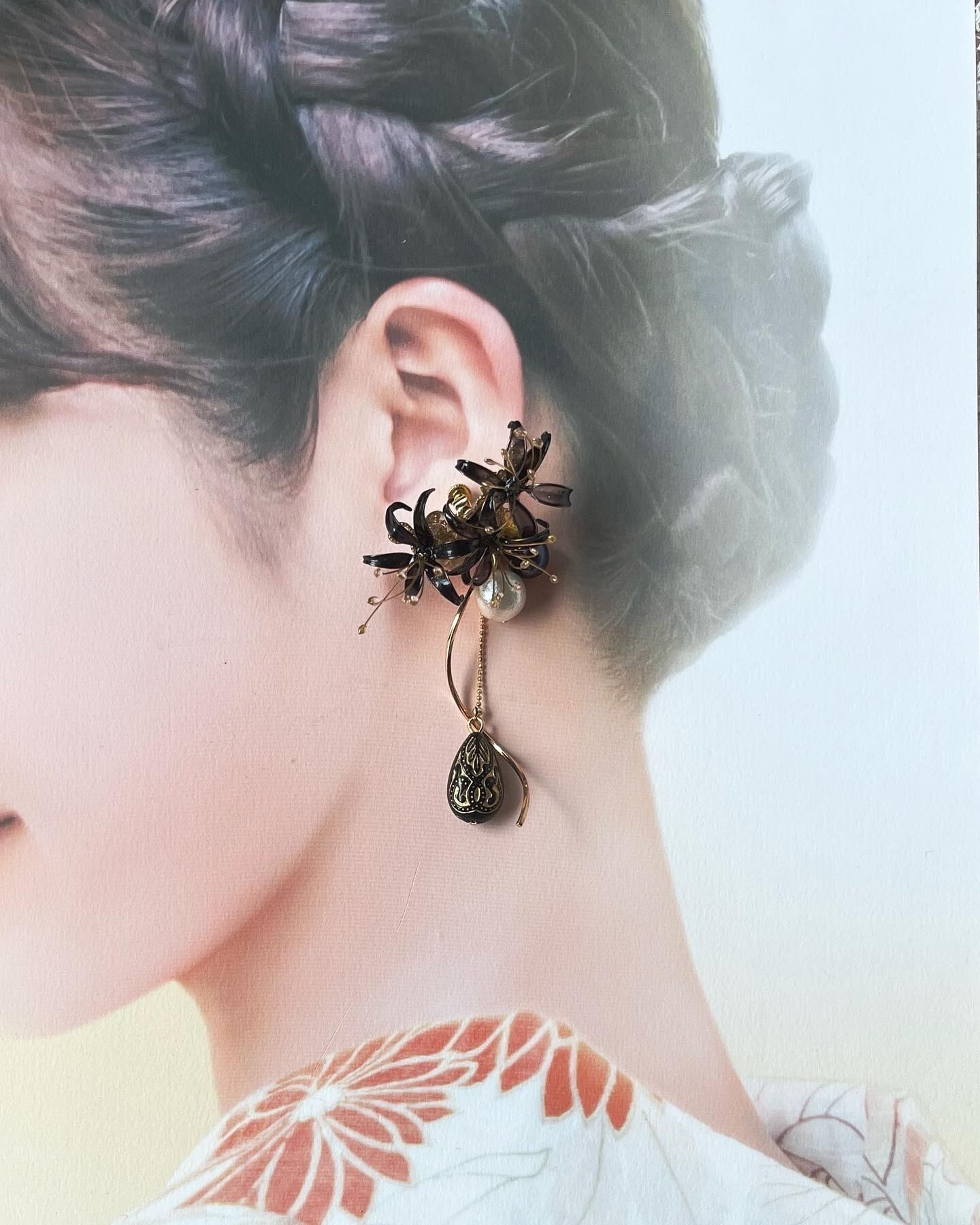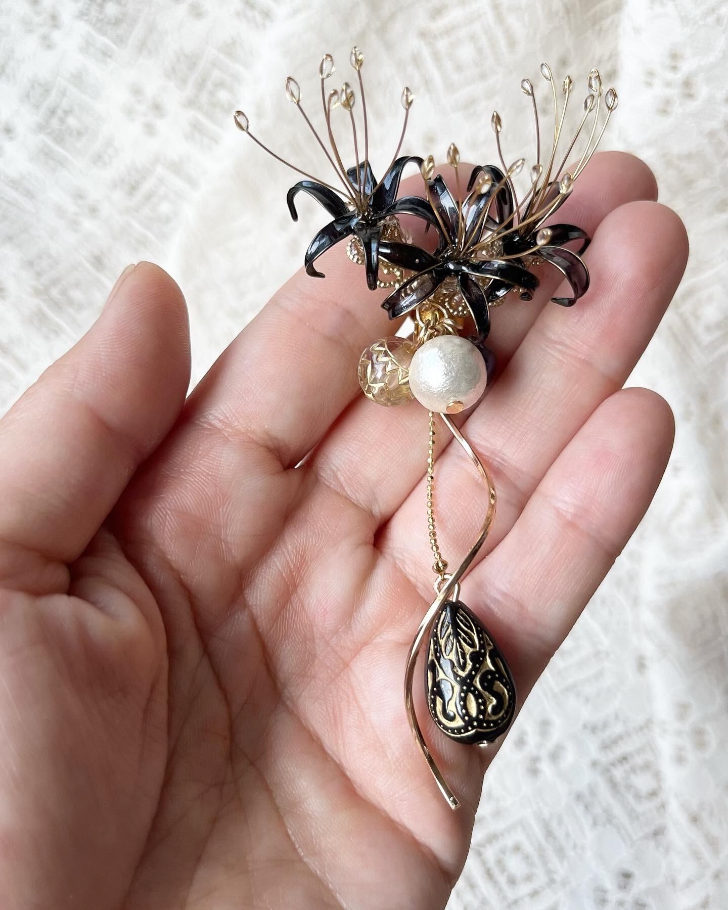 黒い彼岸花には淡水パールを、赤い彼岸花にはヴィンテージの珊瑚ビーズをそれぞれあしらいました。