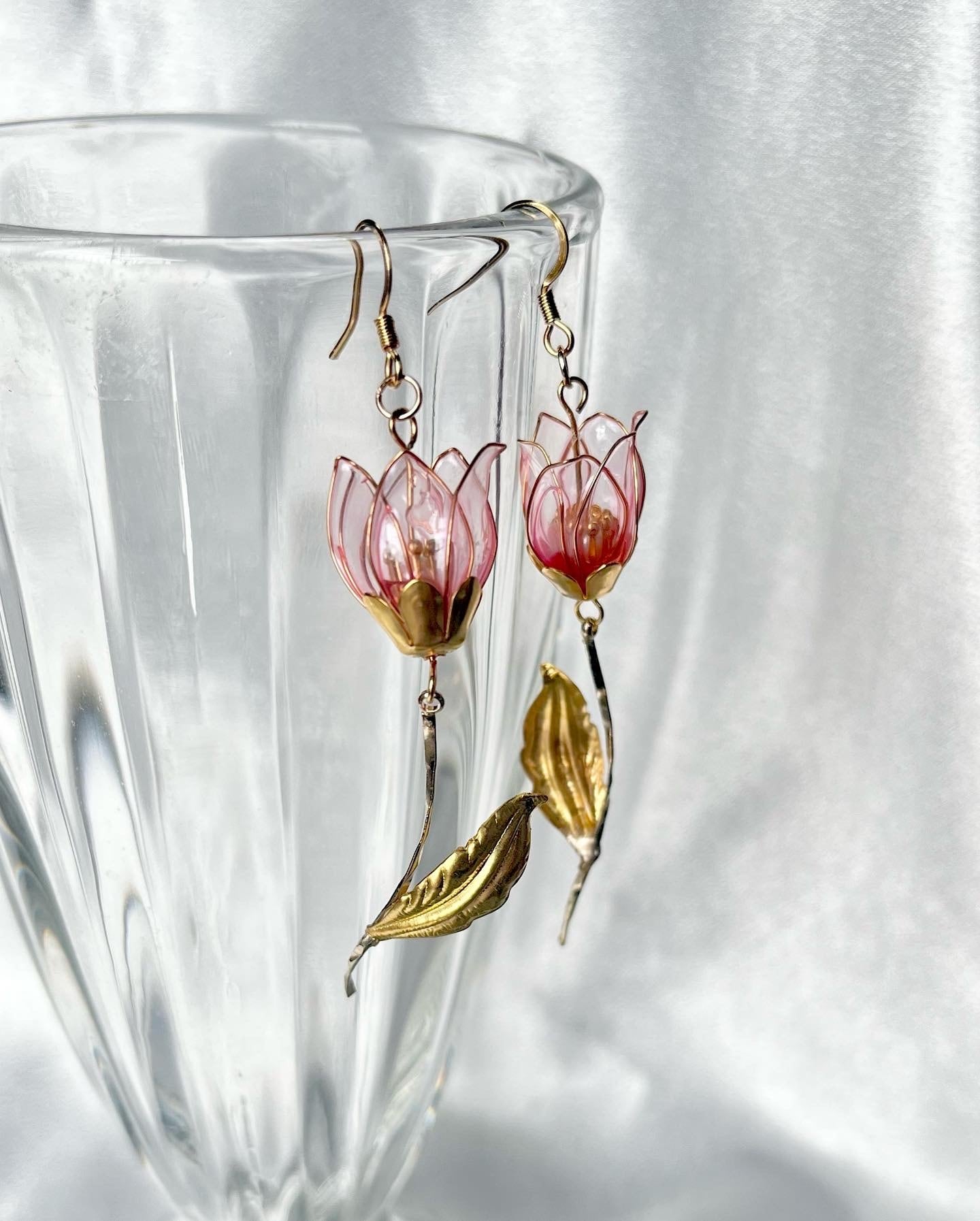 チューリップのピアス/イヤリング クリアピンク ゴールド ディップアート/花/フラワー/可愛い/誕生日/誕生花/プレゼント/ギフト/簡易ラッピング無料/軽い/痛くない/Ruby Lycoris